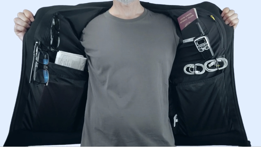 N58の伝統的なカンガルーポケットを開けると、縦型収納システムが登場。トラベルウォレットからドリンクまで、必要なものを安全に手元に保てます。