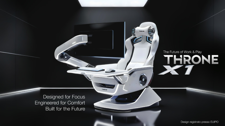 チェアとモニターを含む作業環境をすべて一体化したオールインワンワークステーション「THRONE」 のご紹介です。