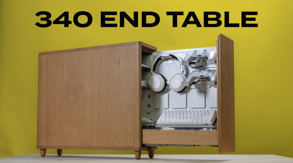 340 End Table は、ゲーミング機器や周辺機器をスマートに整理・保管し、使いたい時にさっと取り出せるよう設計されたモジュラー式エンドテーブル(サイドテーブル)です。